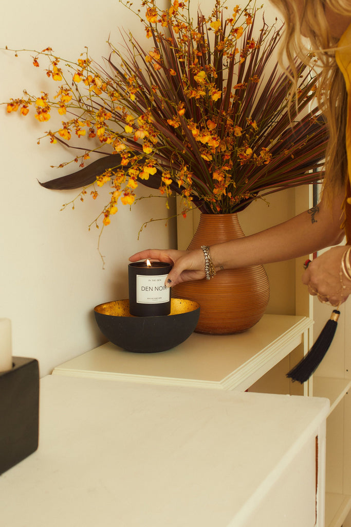 Housed in a sleek black glass vessel, the candle is sophisticated, grounded, and quietly intimate, perfect for setting a moodful, refined tone.